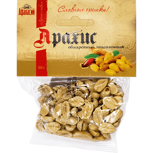 Обжаренный арахис с солью. Это питательный продукт, который поможет быстро утолить голод, и просто вкусный натуральный снек. А благодаря небольшой удобной упаковке, его можно взять с собой для перекуса на прогулке.