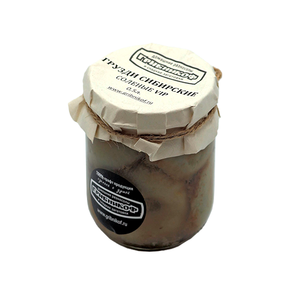 Солёные грузди сибирские, рассол (вода, специи, соль).