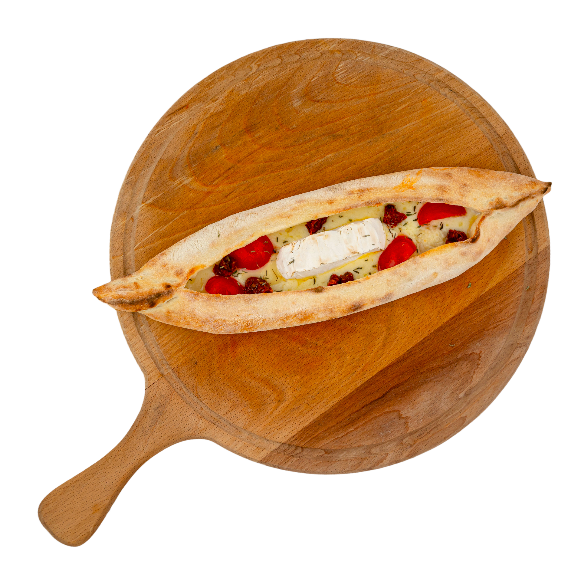 Тесто( мука, дрожжи, соль, сахар, вода, масло оливковое), моцарелла, камамбер, томаты черри, вяленые томаты, тимьян