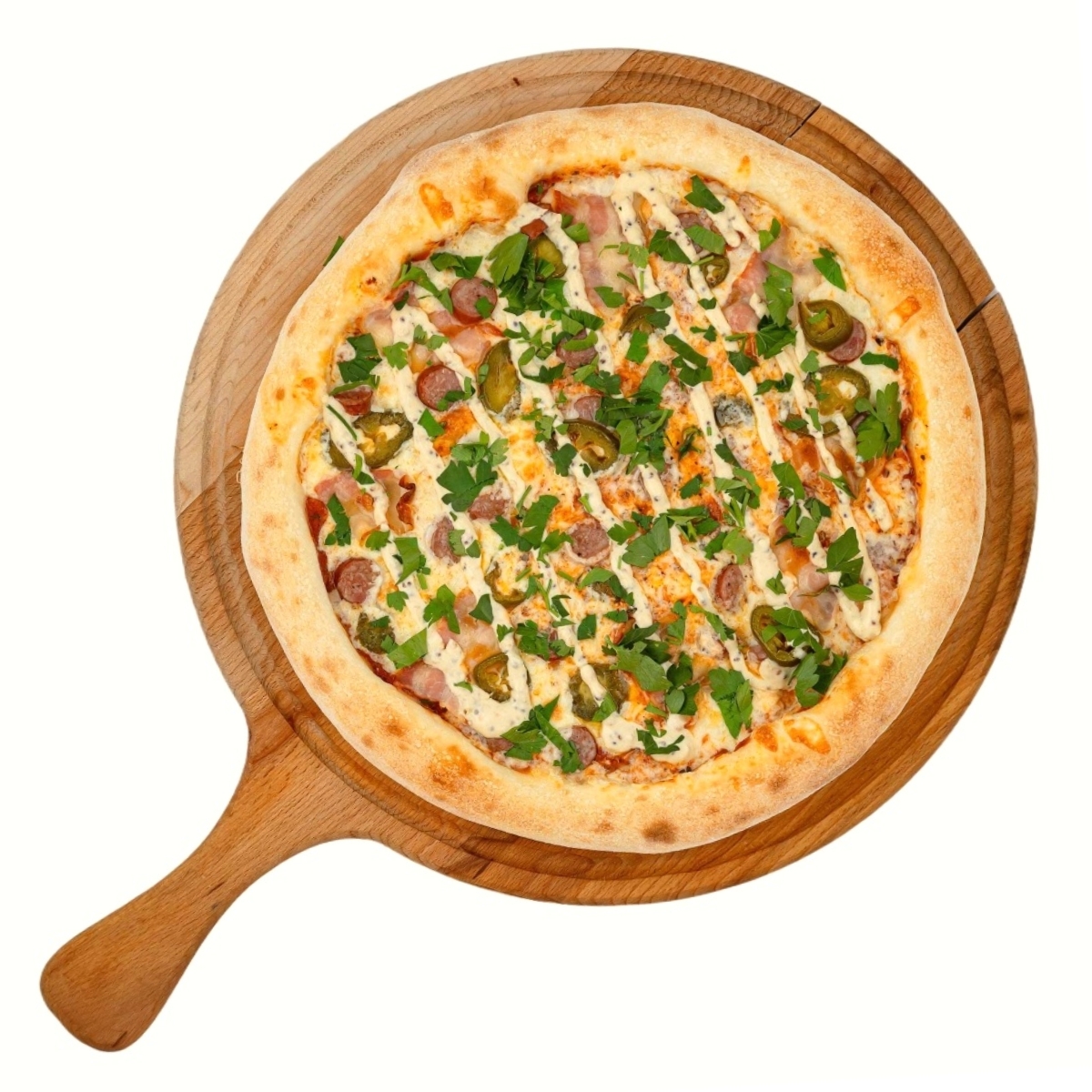 Сочная начинка: Нежная моцарелла плавится в каждом кусочке, а сытный бекон и пикантные охотничьи колбаски добавляют мясной характер. Огненный халапеньо вносит дерзкую нотку, а свежая петрушка — яркий акцент.