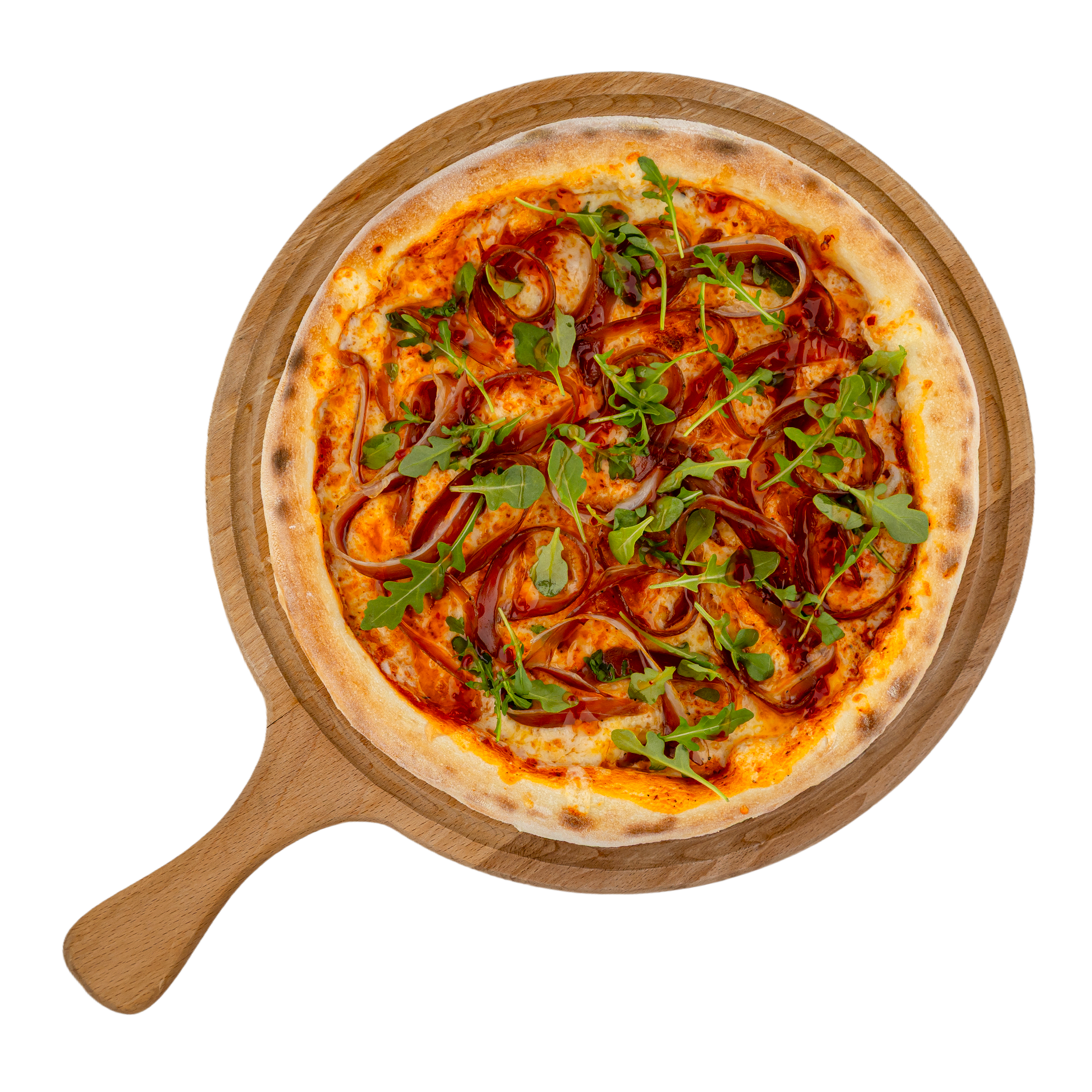 Пицца на тонком тесте «Дикая утка» соединяет нежность утиного карпаччо и сливочность моцареллы с травяными нотами базилика и орегано. Сладкий чили даёт деликатную остринку, а руккола — свежий финал. Ярко, выразительно и очень запоминается.