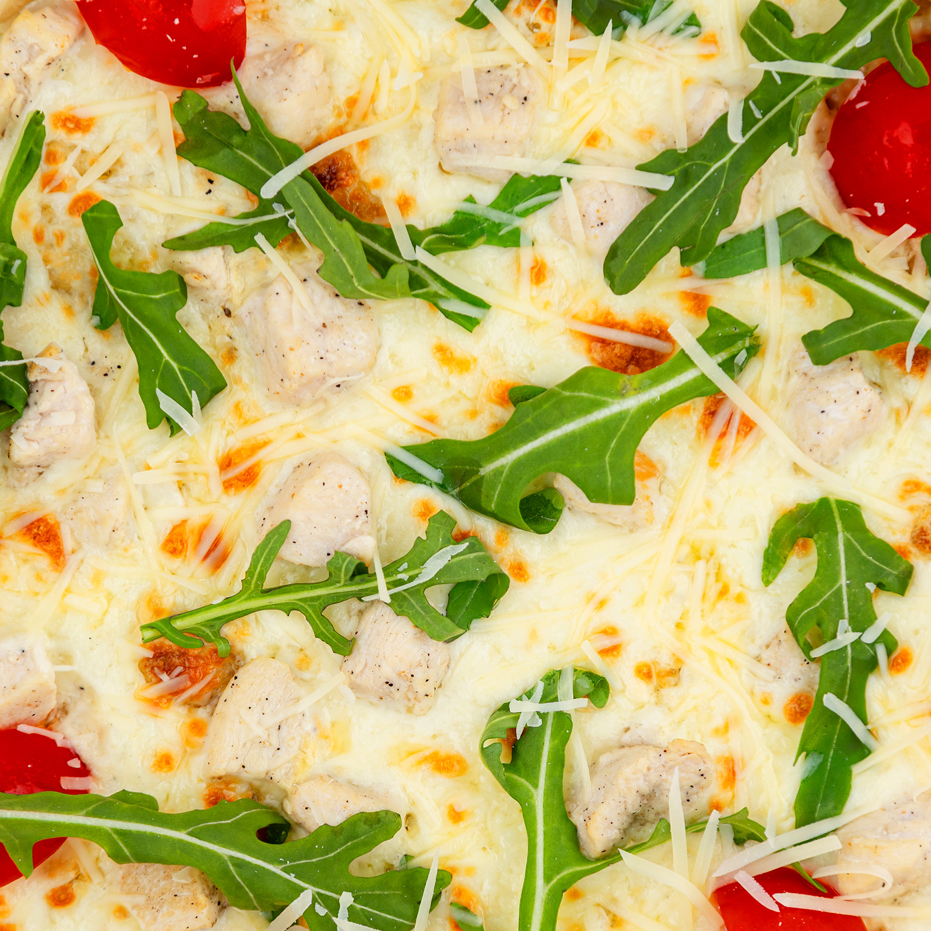 Тесто (мука, дрожжий, соль, сахар, вода, масло оливковое), соус цезарь (майонез, анчоусы, каперсы, хрен, горчица), моцарелла, курица, черри, пармезан, рукола.