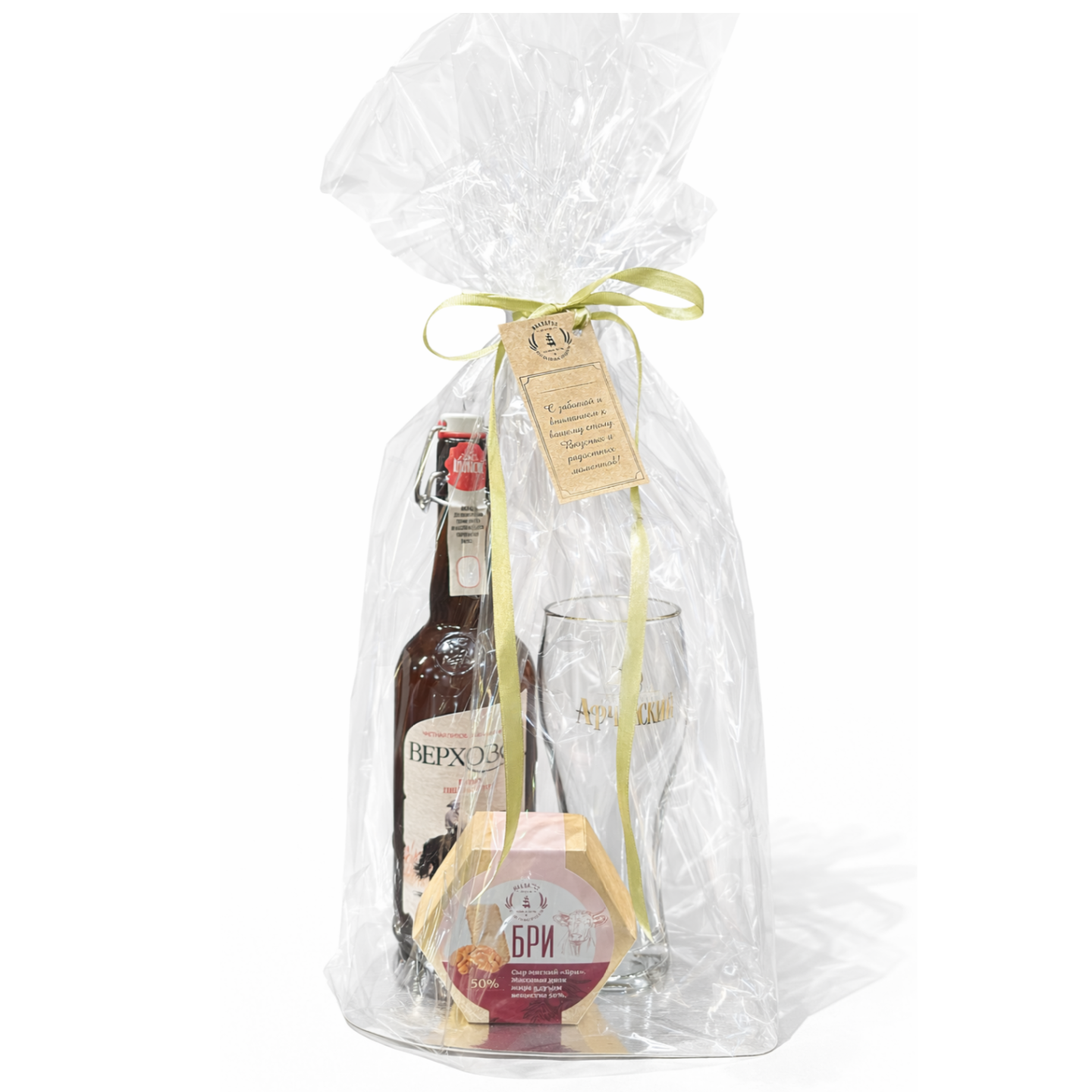 Небольшой, но стильный знак внимания для ценителей пива и гастрономических сочетаний. В наборе — декоративный бокал для пива (0,5 л), пиво «Верховое» 0,75 л и мягкий сливочный сыр Бри (120 г).