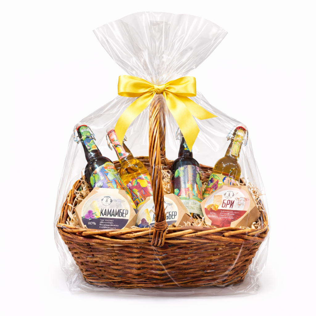 Нежная и стильная гастрономическая корзина, которая станет прекрасным знаком внимания к празднику. В составе — четыре фруктовых и яблочных сидра (слива, груша, яблочный полусладкий и полусухой) и три мягких сыра: камамбер классический, камамбер с чёрным трюфелем и бри.